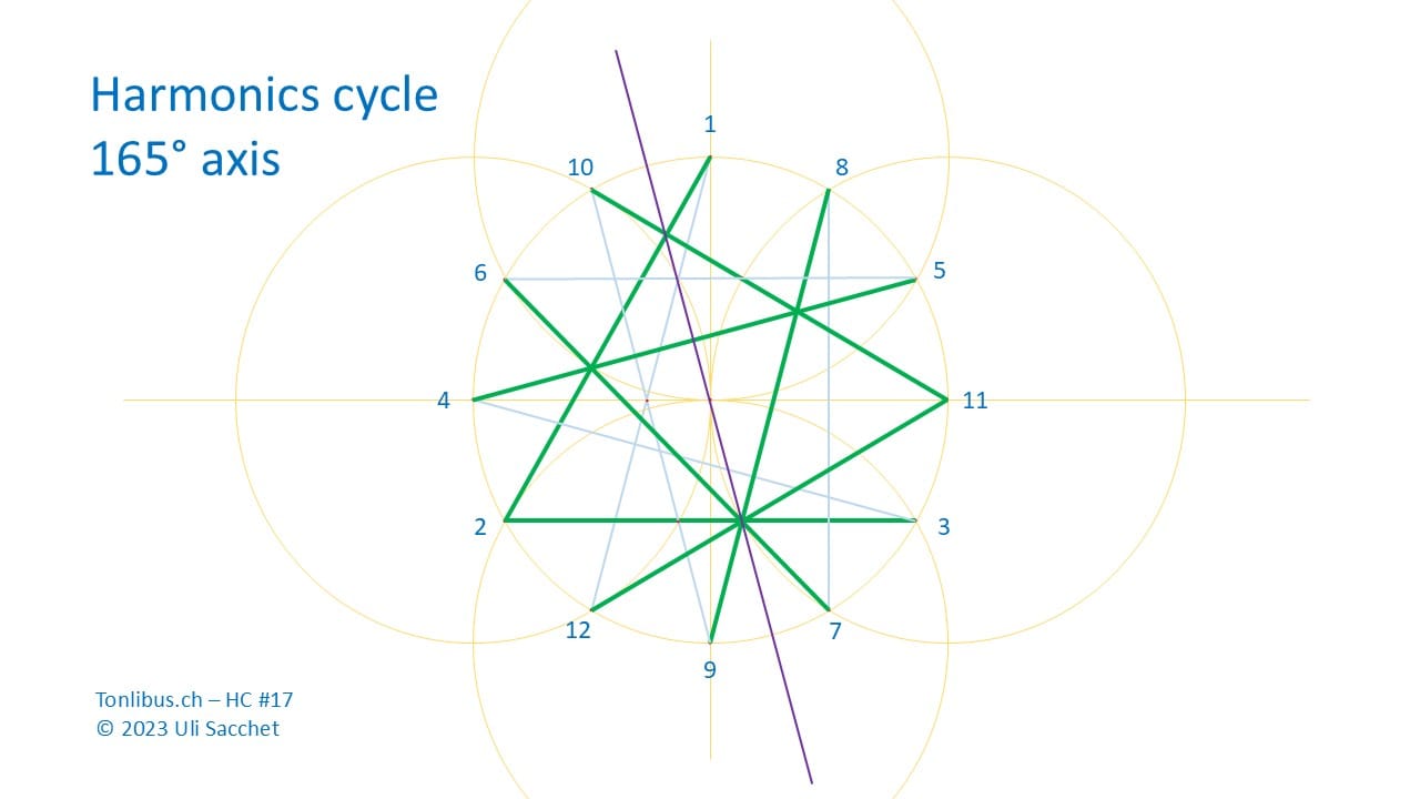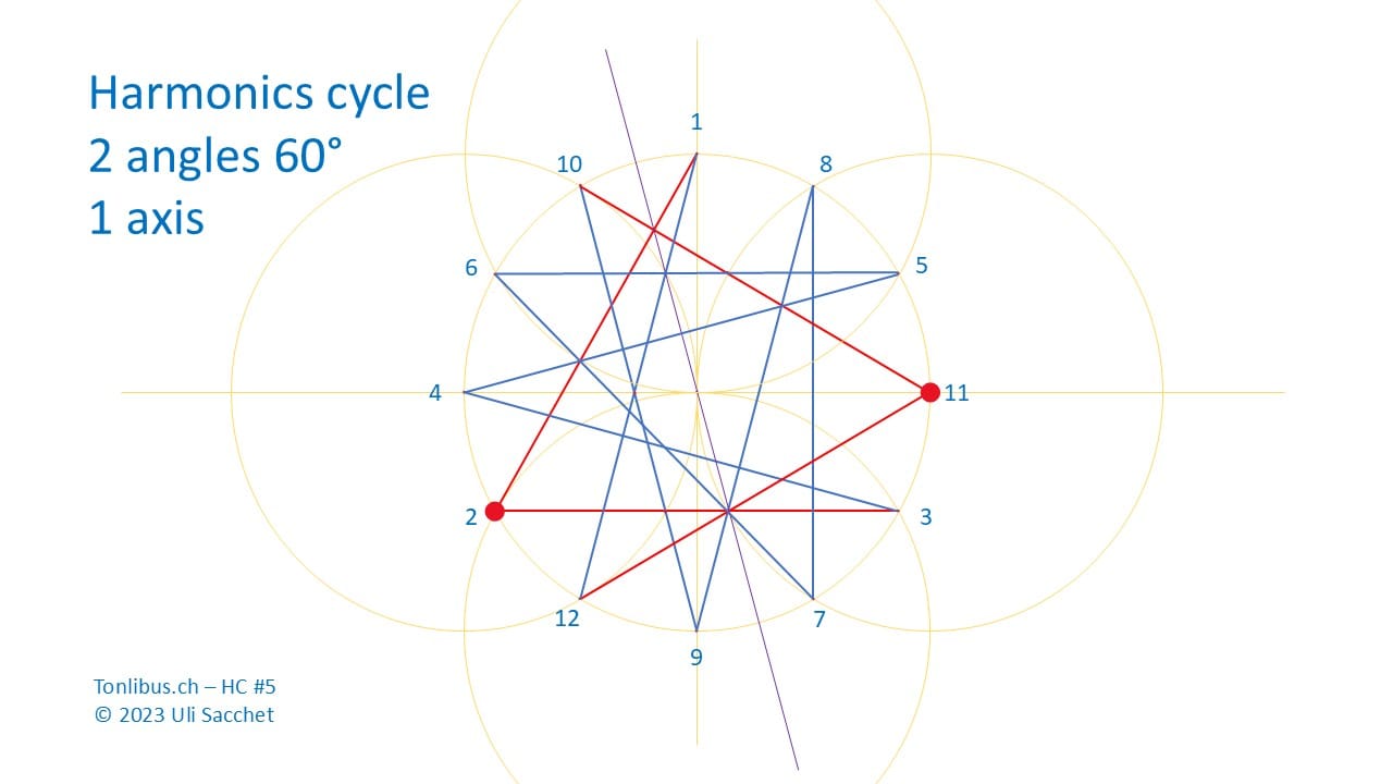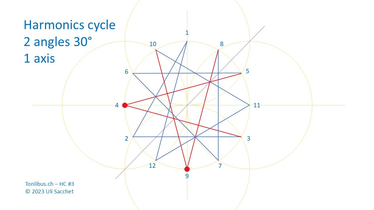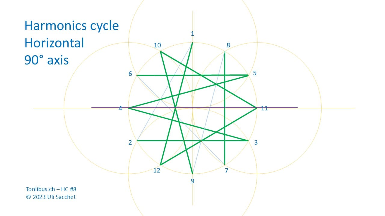 Einige Details zu MixoBal oder HexaNaMix, eine Mixolydisch-Ableitung, finden sich im Beitrag Tonalität des Monats Juni 2023. Sie ist zwar als Ableitung in der Übersichts-Tabelle der Tonalitäten nach unterem und oberem Tetrachord und der Na-Tonalitäten verzeichnet, wird aber als Ableitung im Tonalibus-Katalog von Tonalitäten nicht weiter aufgeführt. Sie führte jedoch zu der folgenden Darstellung des Oberton-Zyklus.